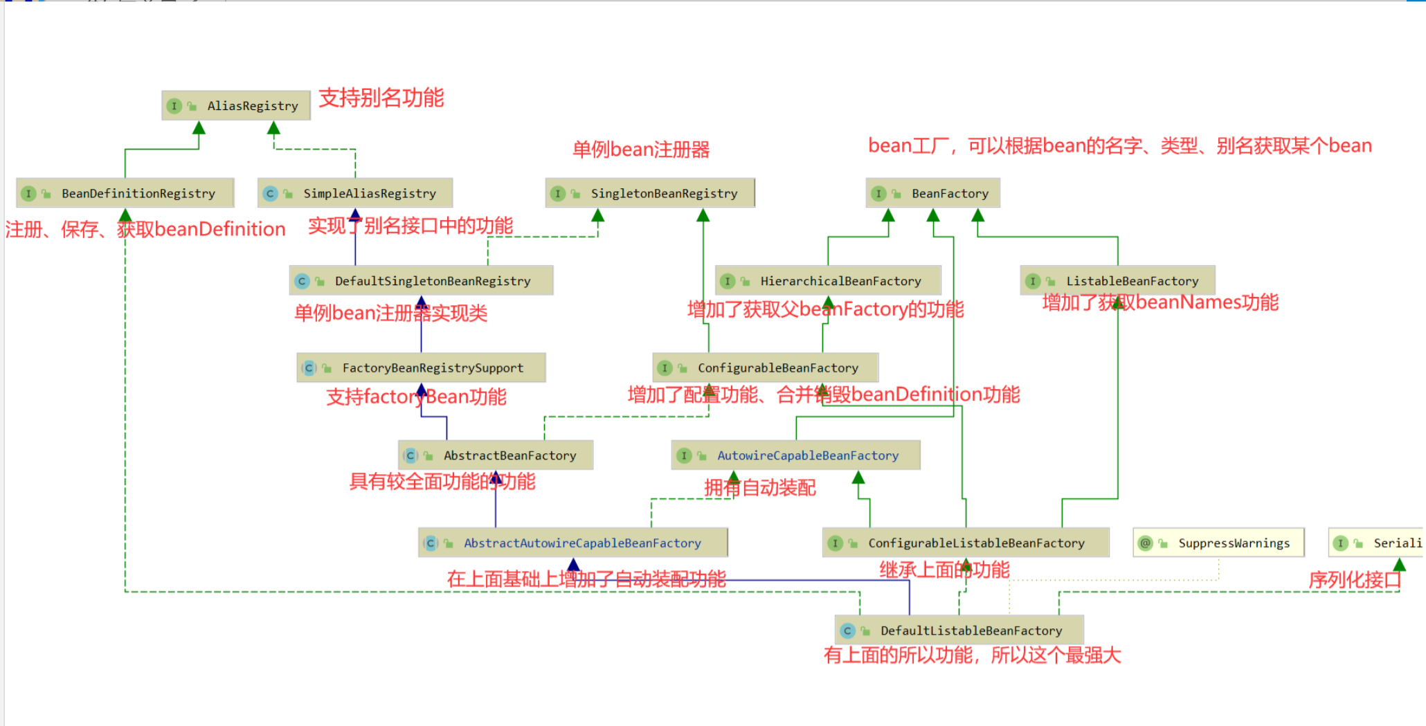 beanFactory有存放bean,生成bean的功能,但它只是一个接口,spring中最核心的是DefaultListableBeanFactory,它是beanFactory最底层的类,获取beanDefinition、注册beanDefinition、别名功能、bean注册、获取bean、自动装配功能等等。